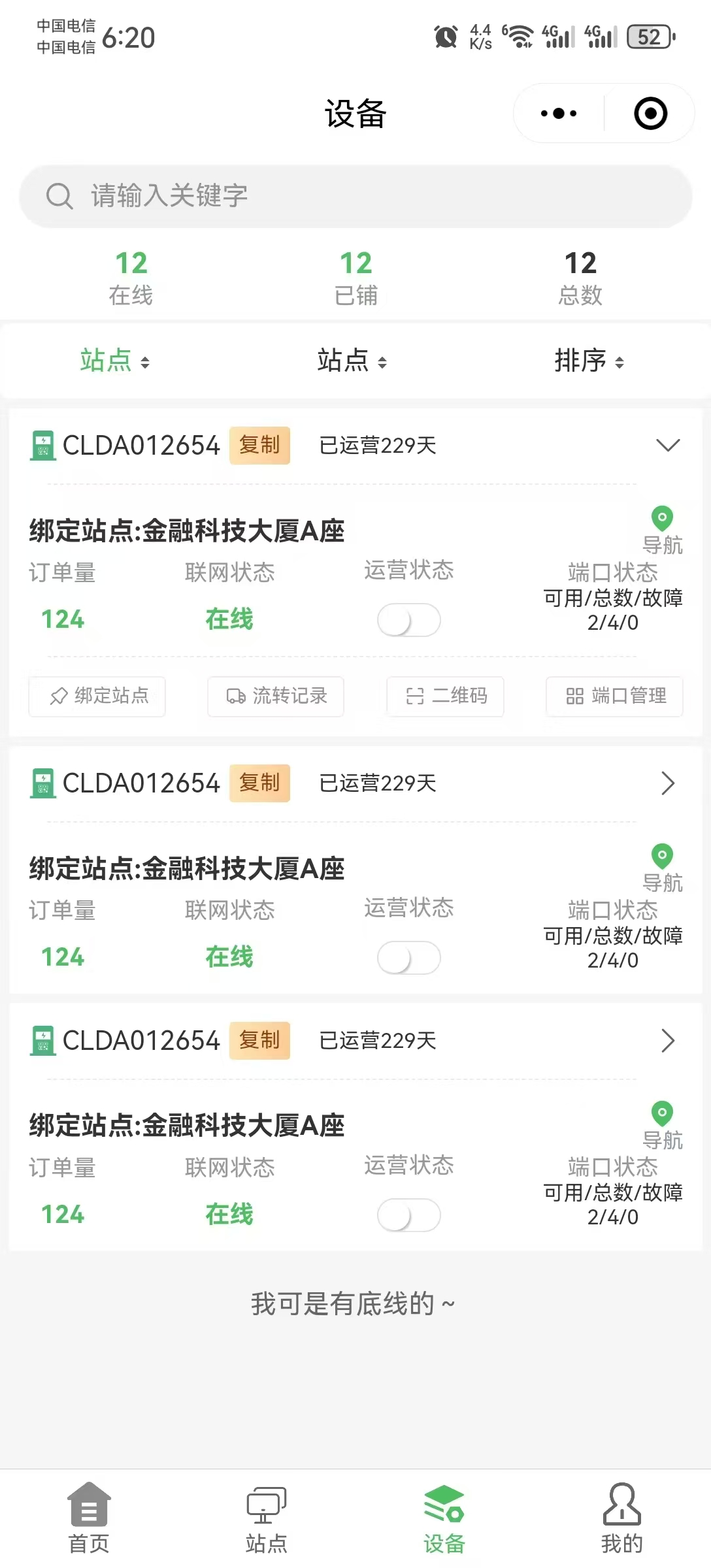 社保绑定到站点,提供联网状态,运营状态,可用总和端口问题及扫码充电,设备流转、返修